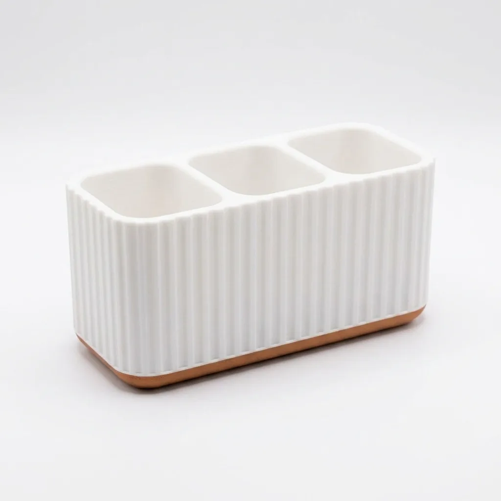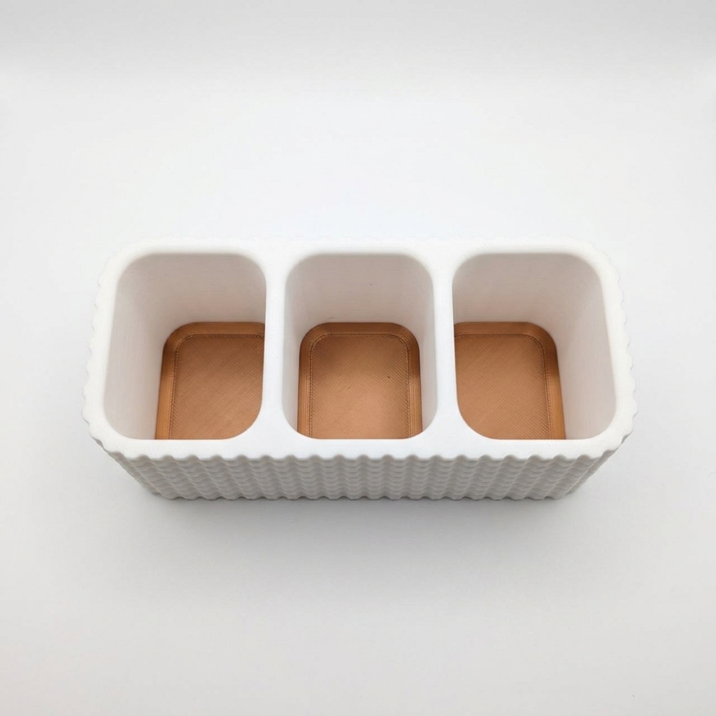 Elegantan držač za daljinski upravljač u bakarno-beloj kombinaciji. Održava red na sto ili policu, dok izgleda kao dekorativni detalj.