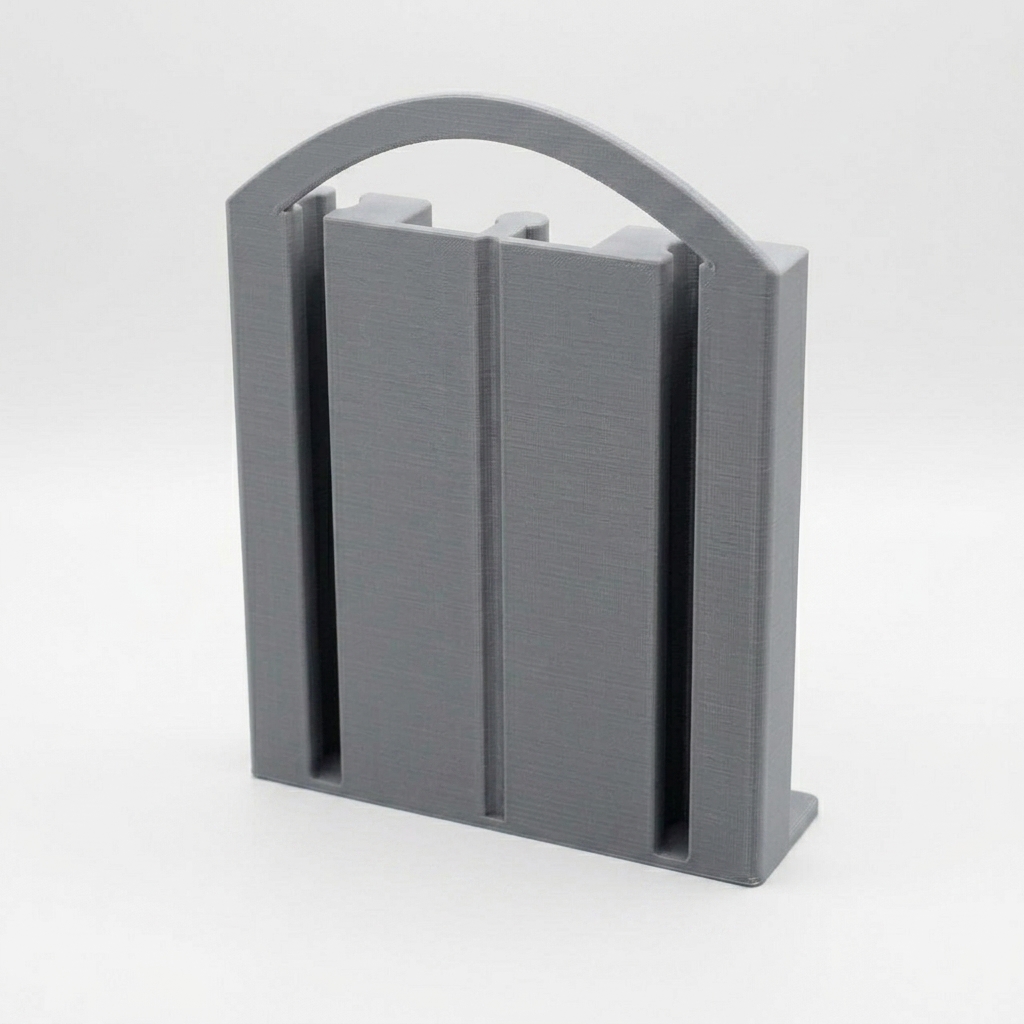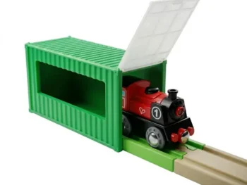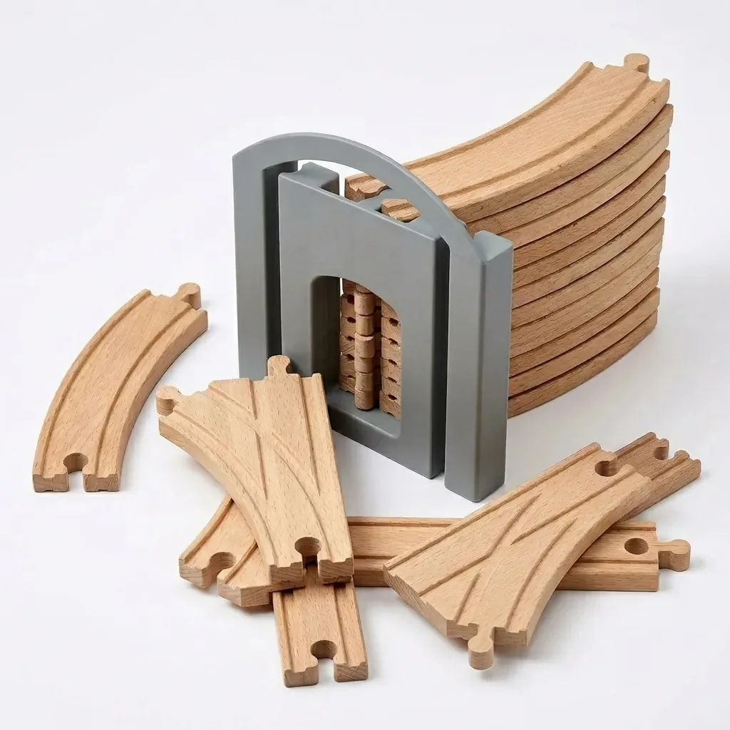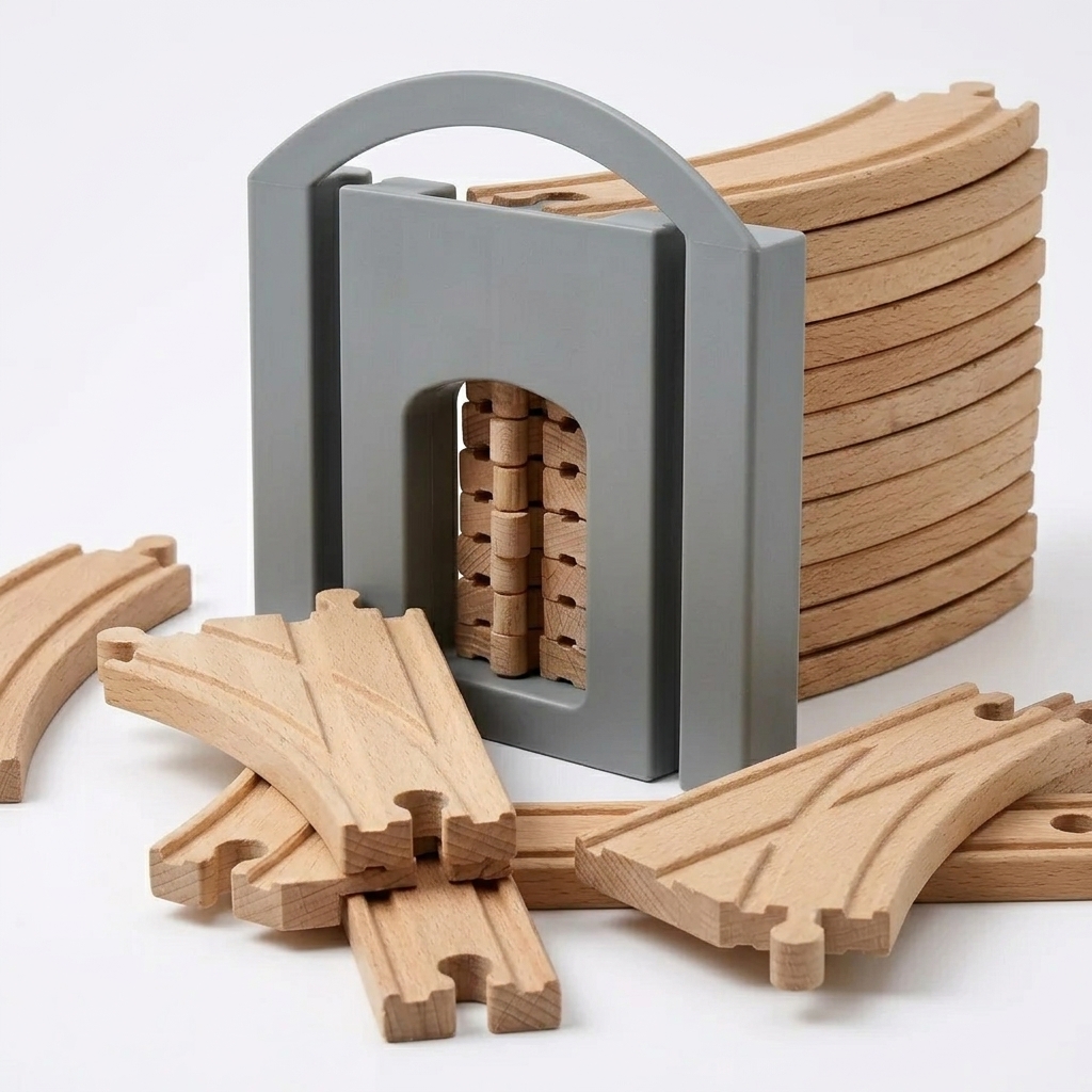 Zaboravite na rasejane tračnice po podu. Ovaj držač je dizajniran da uredno čuva sve delove drvenih tračnica za igračke na jednom mestu.
