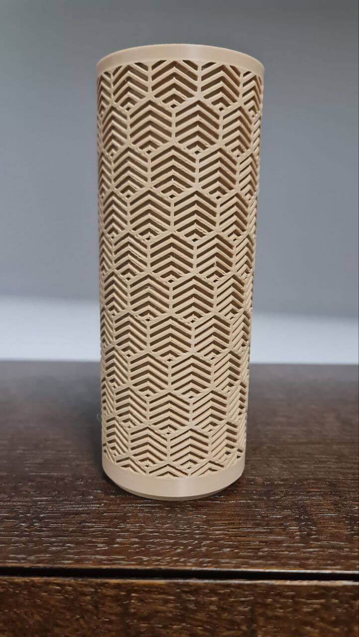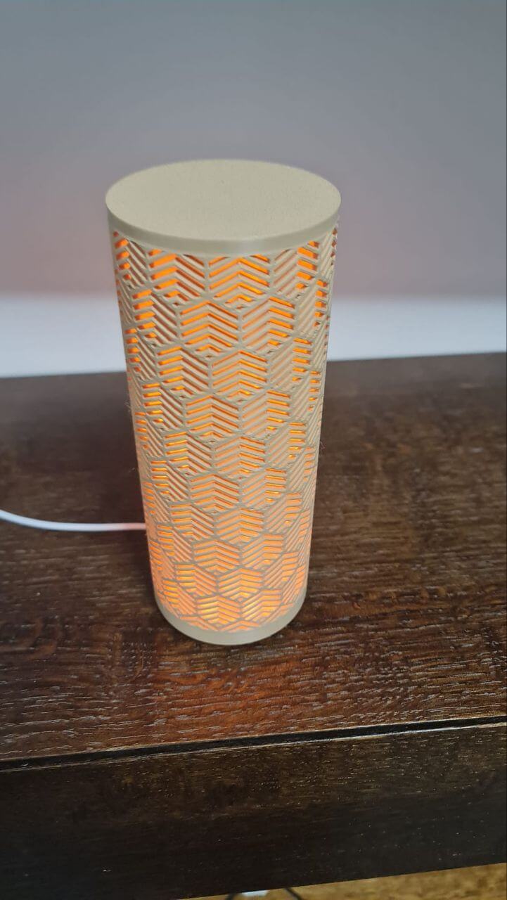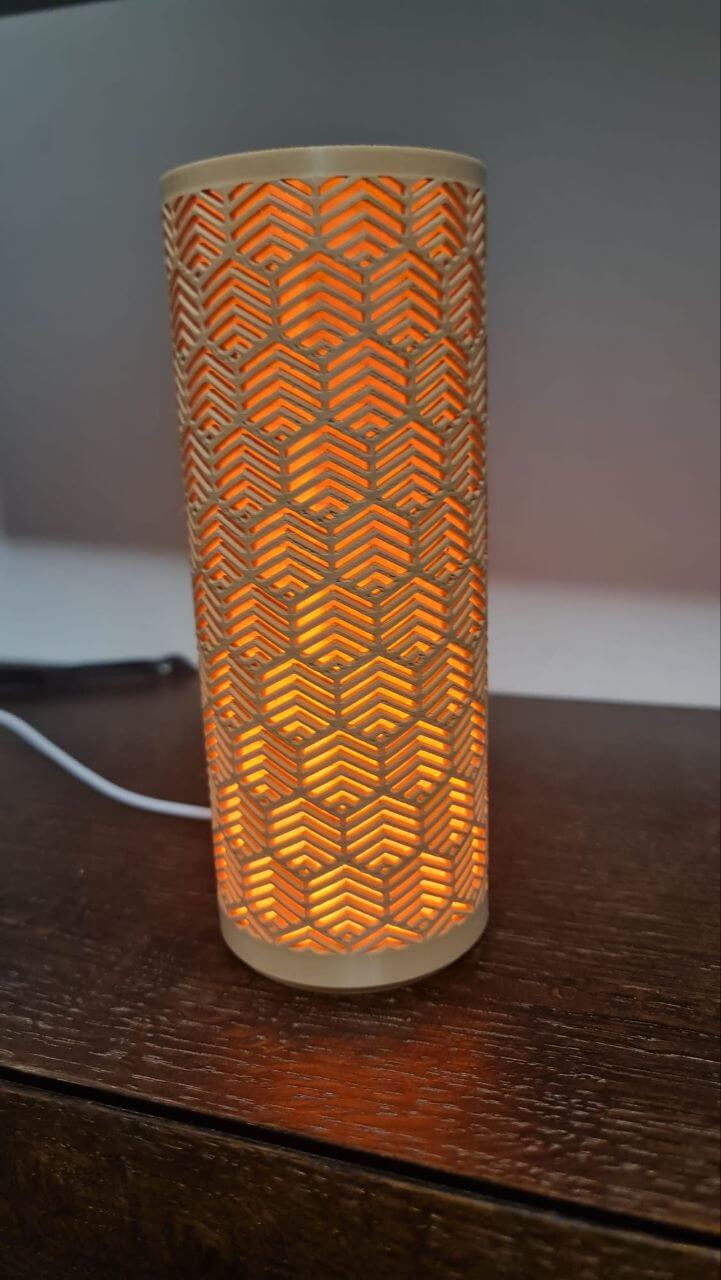 Elegantna cilindrična lampa sa precizno izrezanim geometrijskim uzorkom. Topla narandžasta svetlost kroz slojeviti reljef stvara mekani, ambijentalni sjaj. Idealna za noćni sto, policu ili dekor.