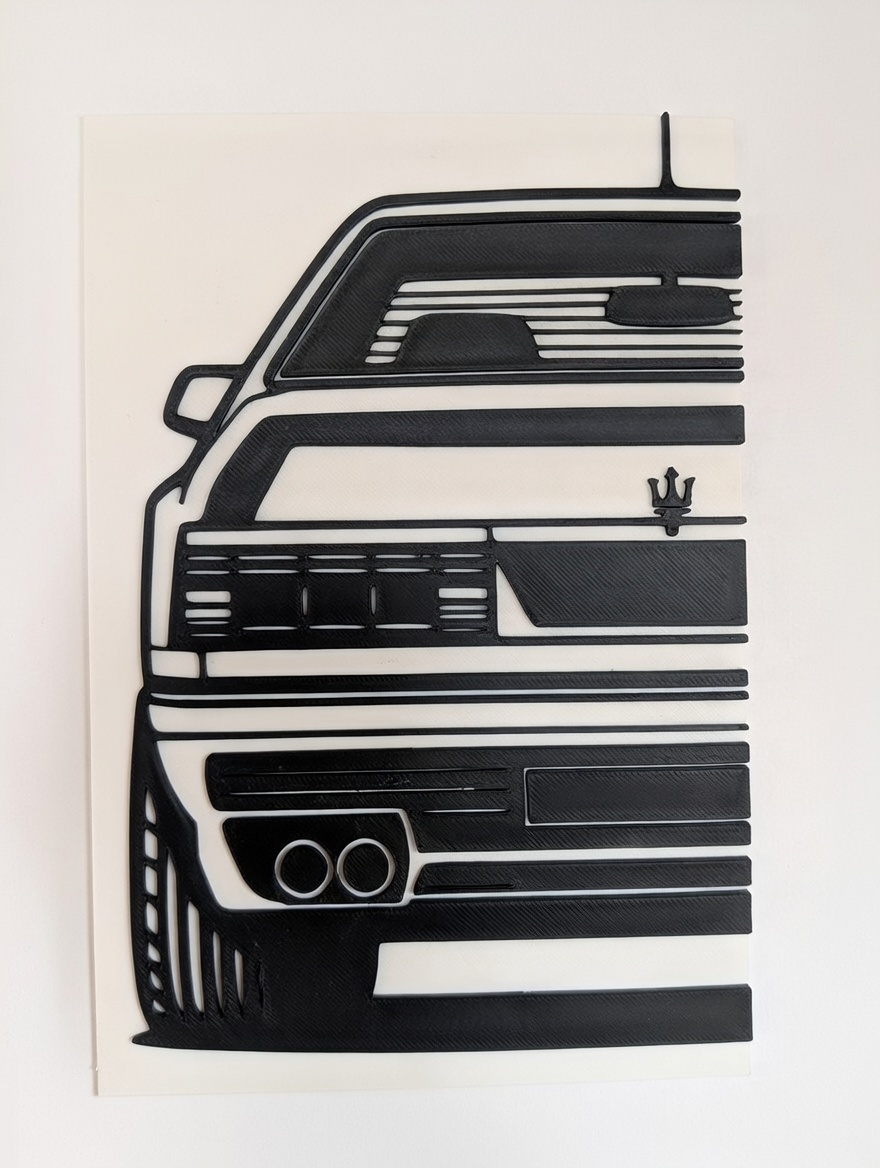 Minimalistički, višeslojni 3D reljef prednjeg dela legendarnog Maseratija (Biturbo / Shamal / Karif era). Čista silueta, prepoznatljivi detalji, ikonični trozubac – savršeno za garažu, kancelariju ili kolekcionarski zid.