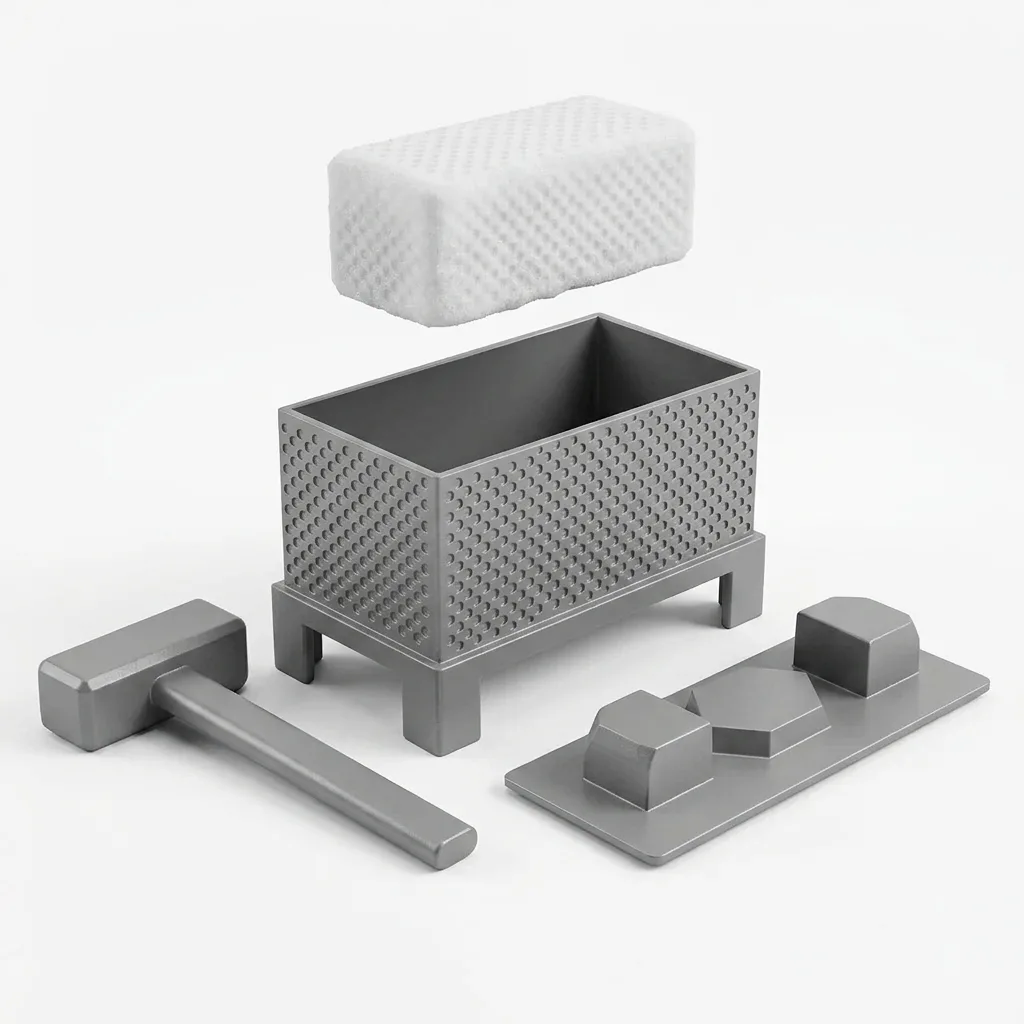 - Kalup ima teksturisanu spoljašnju površinu za siguran hvat u rukavicama i dodatnu krutost, tako da cigle izlaze guste, oštrih ivica i ujednačene veličine.