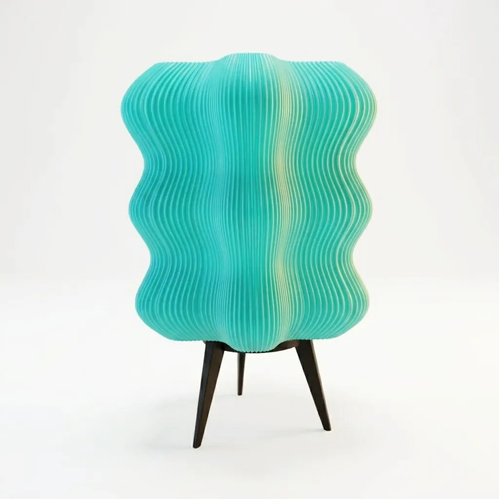 Unikatna talasasta lampa u tirkiznoj boji sa elegantnim crnim postoljem. Organski cvetni oblik koji osvaja na prvi pogled.